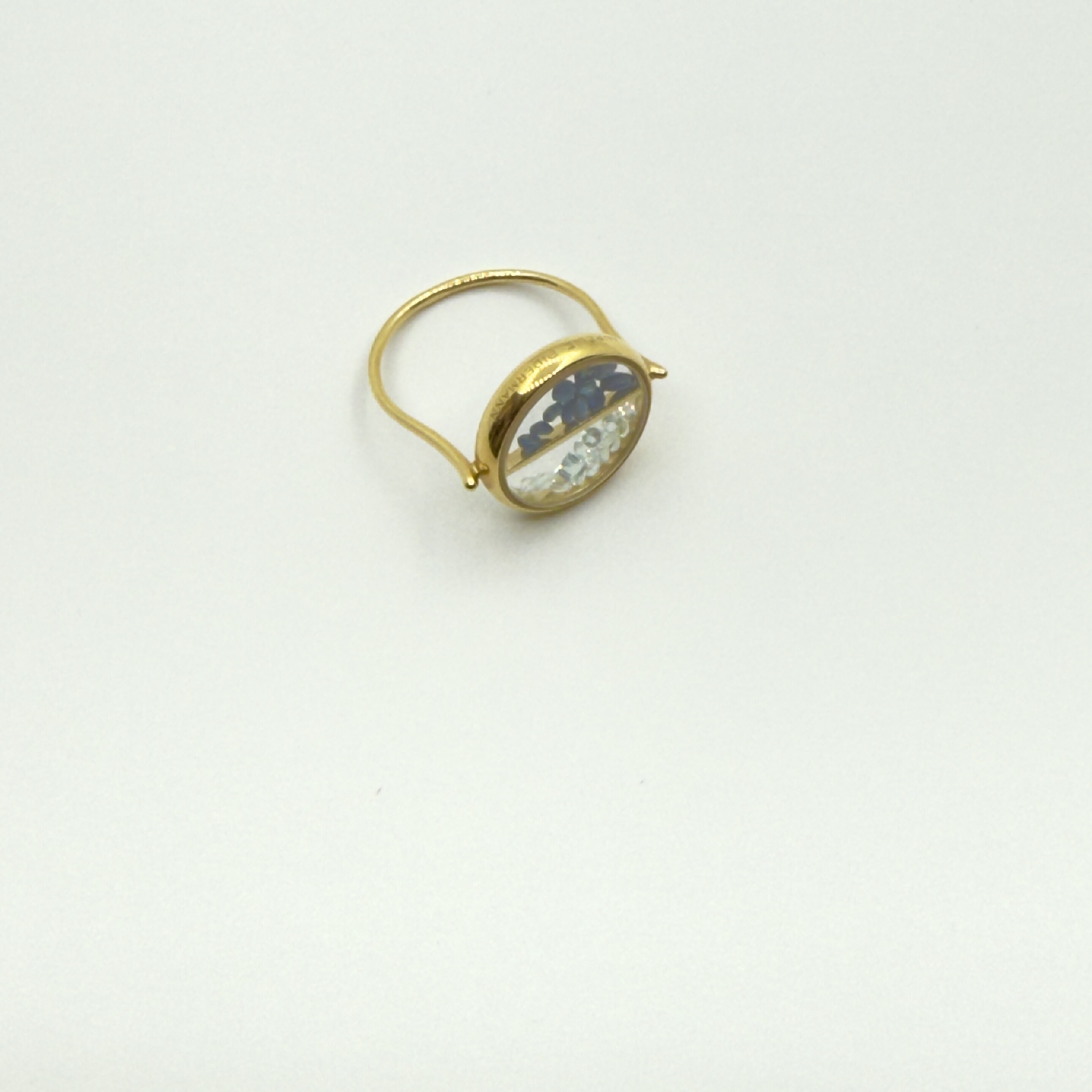 Bague Chivor formée de deux verres saphir scellés et cerclés d’or jaune 750/1000 contenant des saphirs et topazes bleues de taille "rose cut".