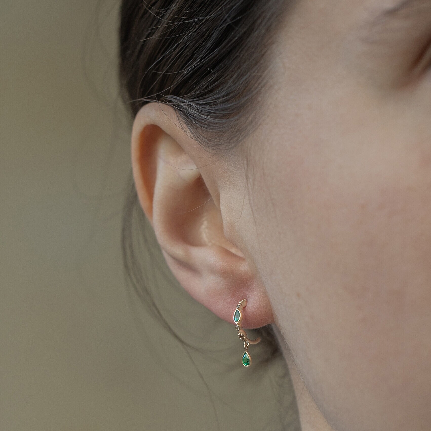 Boucle d'oreille créole Celine Daoust en or jaune clair 14 carats, sertie de tourmalines et de diamants. La couleur des pierres est d'un vert intense.