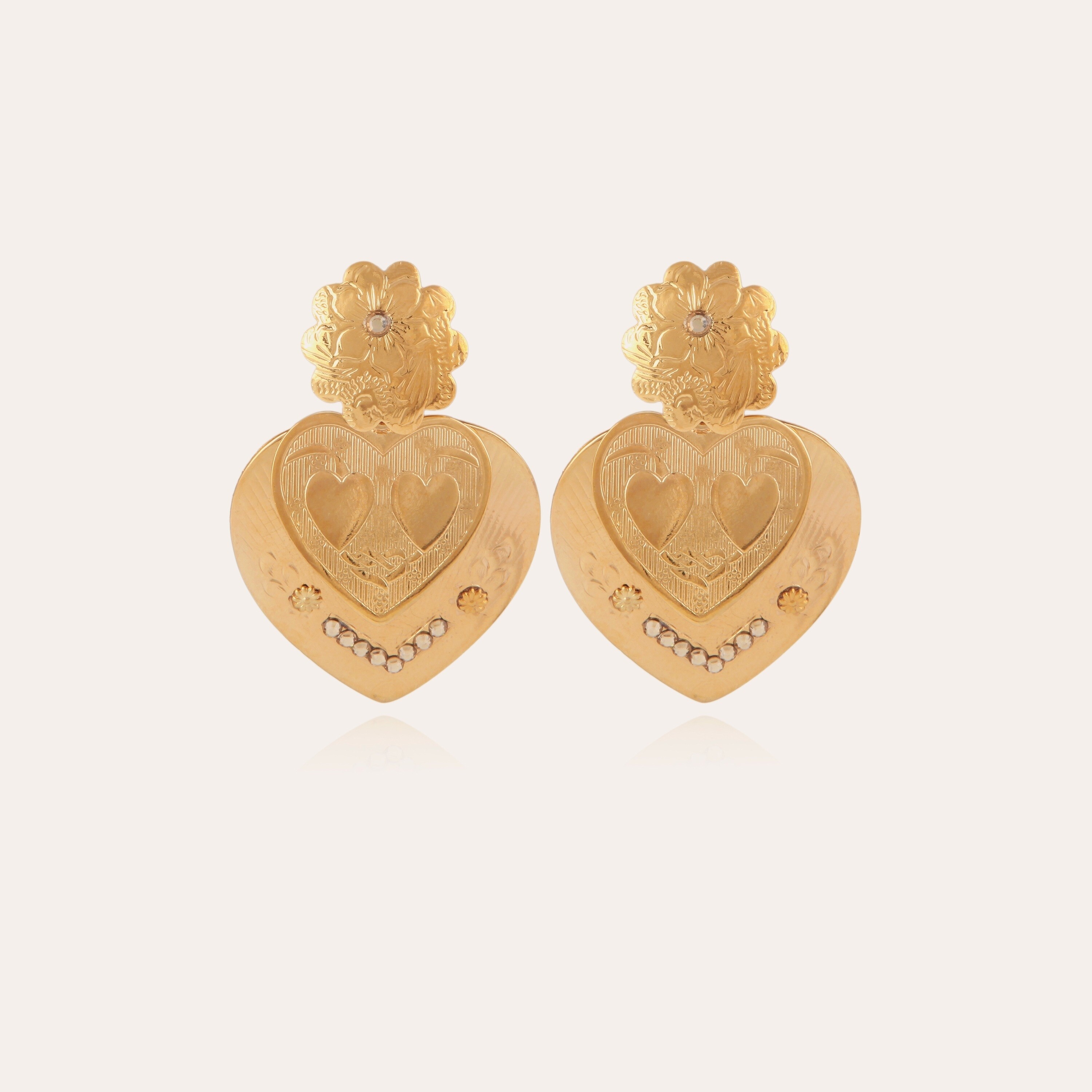 Élégantes et raffinées, ces boucles d’oreilles pendantes dorées à l'or fin allient légèreté et finesse. Depuis plus de 30 ans, cette collection iconique célèbre l’amour avec ses cœurs suspendus, gravés de motifs délicats. Entre reflets subtils et mouvement fluide, chaque pièce incarne le savoir-faire artisanal et l’intemporalité de la Maison.