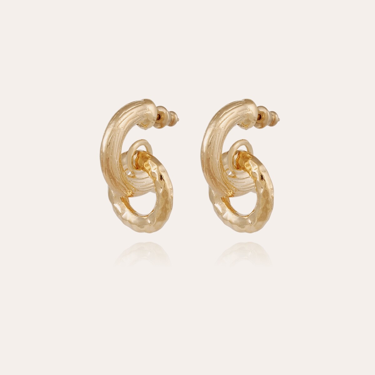 Boucles d'oreilles dorées à l'or fin, composées de deux anneaux striés et martelés.