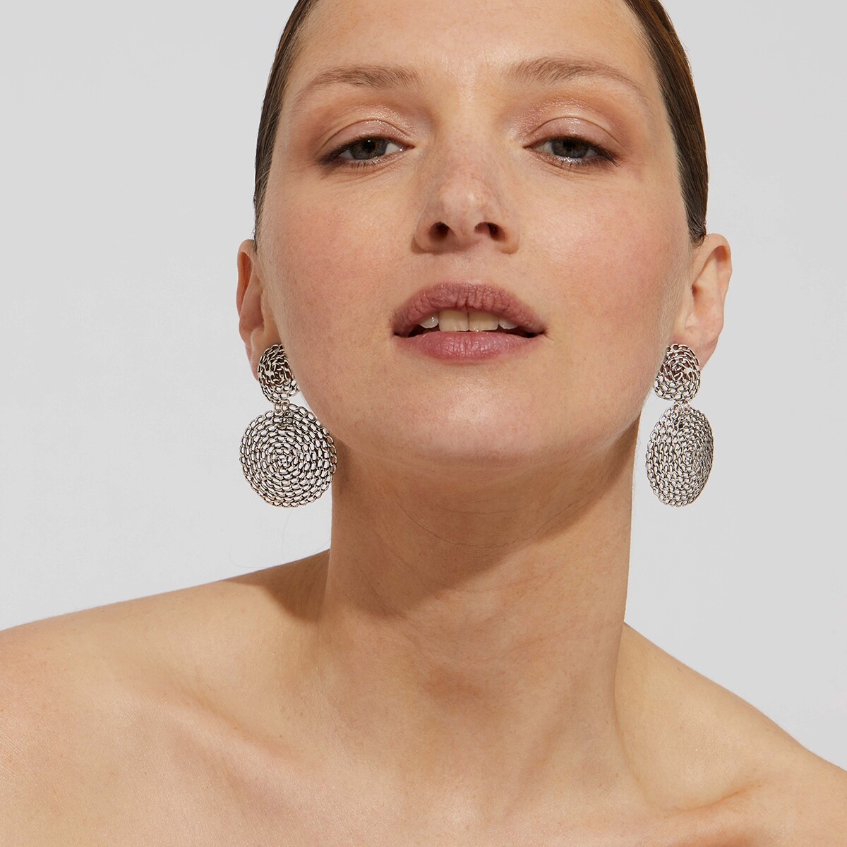 Boucles d'oreilles argentées, composées de deux spirales de chaînes délicatement martelées à la main. Chaque spirale est la résonance de l'autre, dont les proportions subtilement ajustées forment un équilibre parfait.