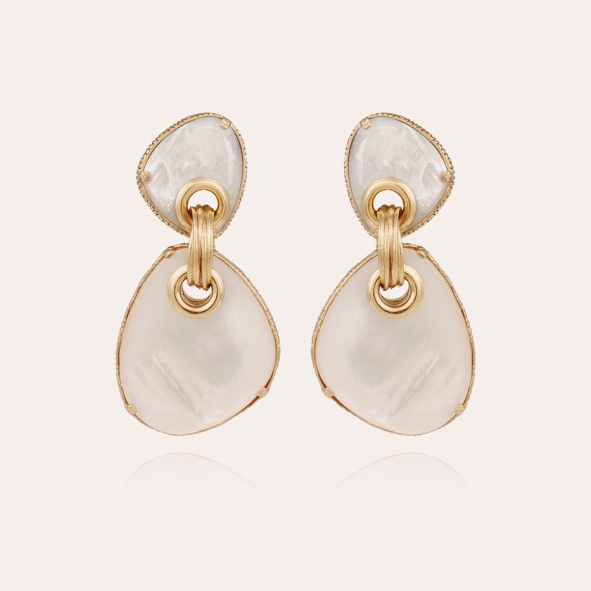Boucles d'oreilles dorées à l'or fin composées de deux médaillons en nacre blanche reliés par un anneau au centre délicatement martelé.