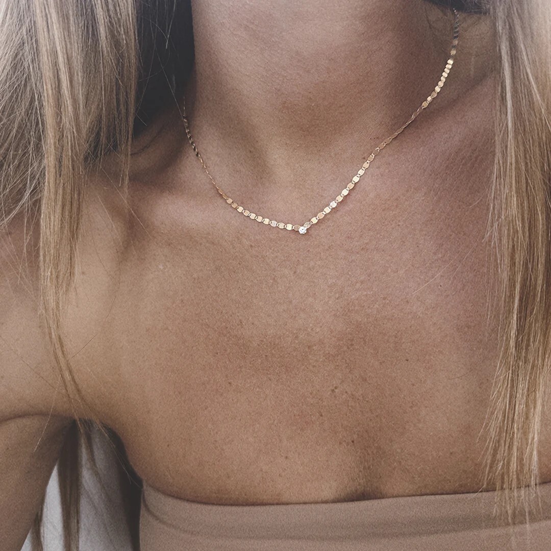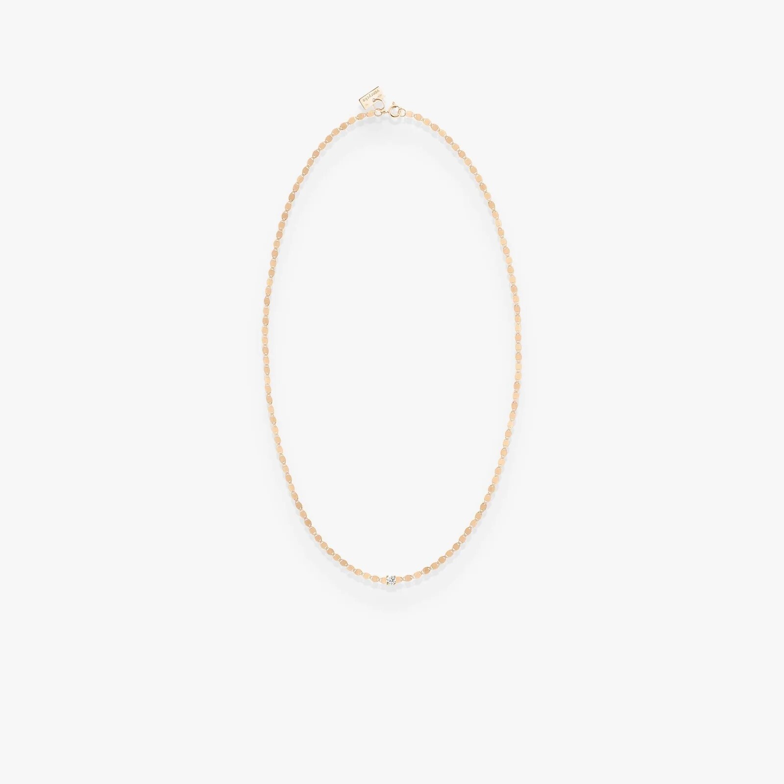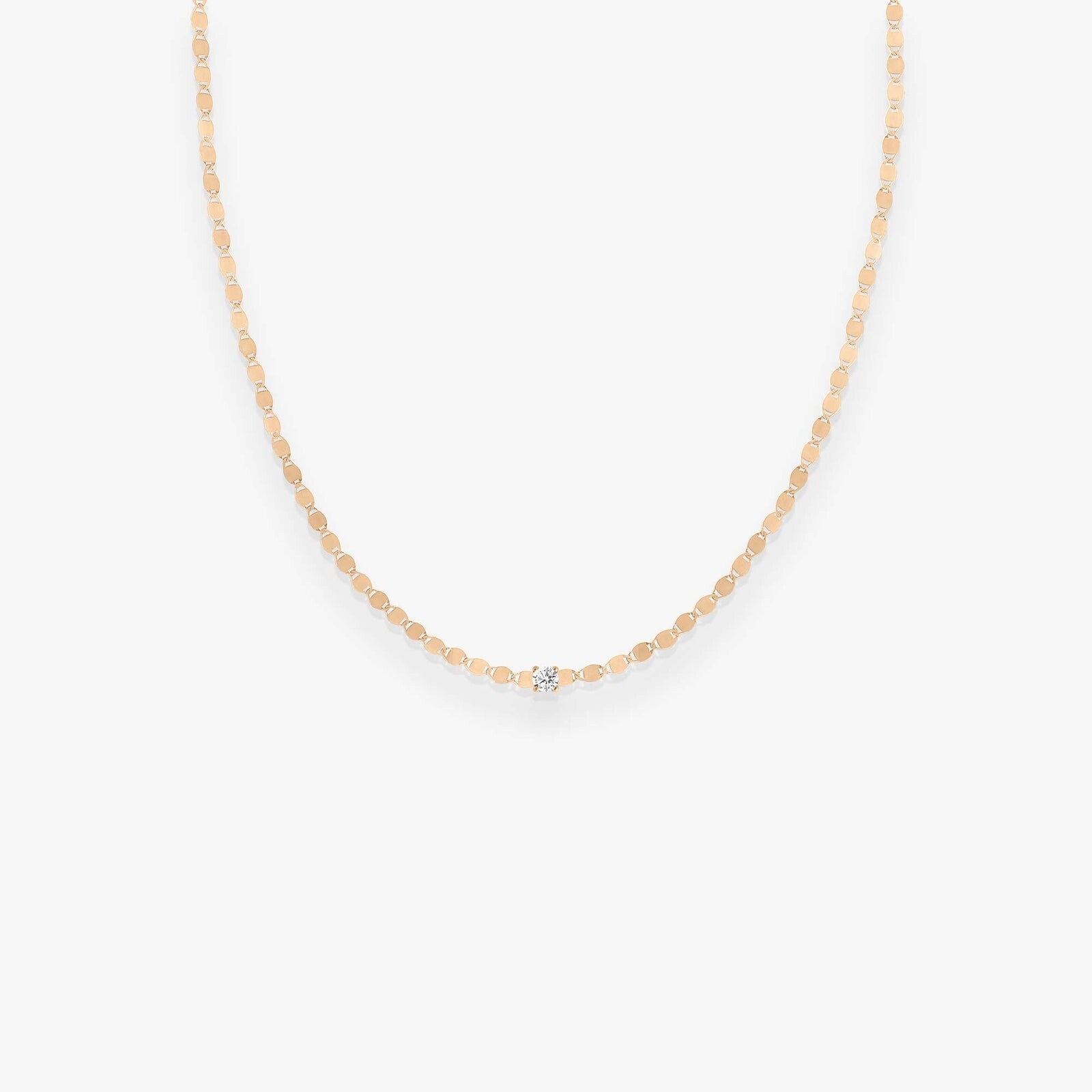 Le collier Skin Tattoo, composé de pastilles d’or scintillantes qui épousent la peau comme un bijou invisible, se pare en son centre d’un diamant de 0,11 ct.